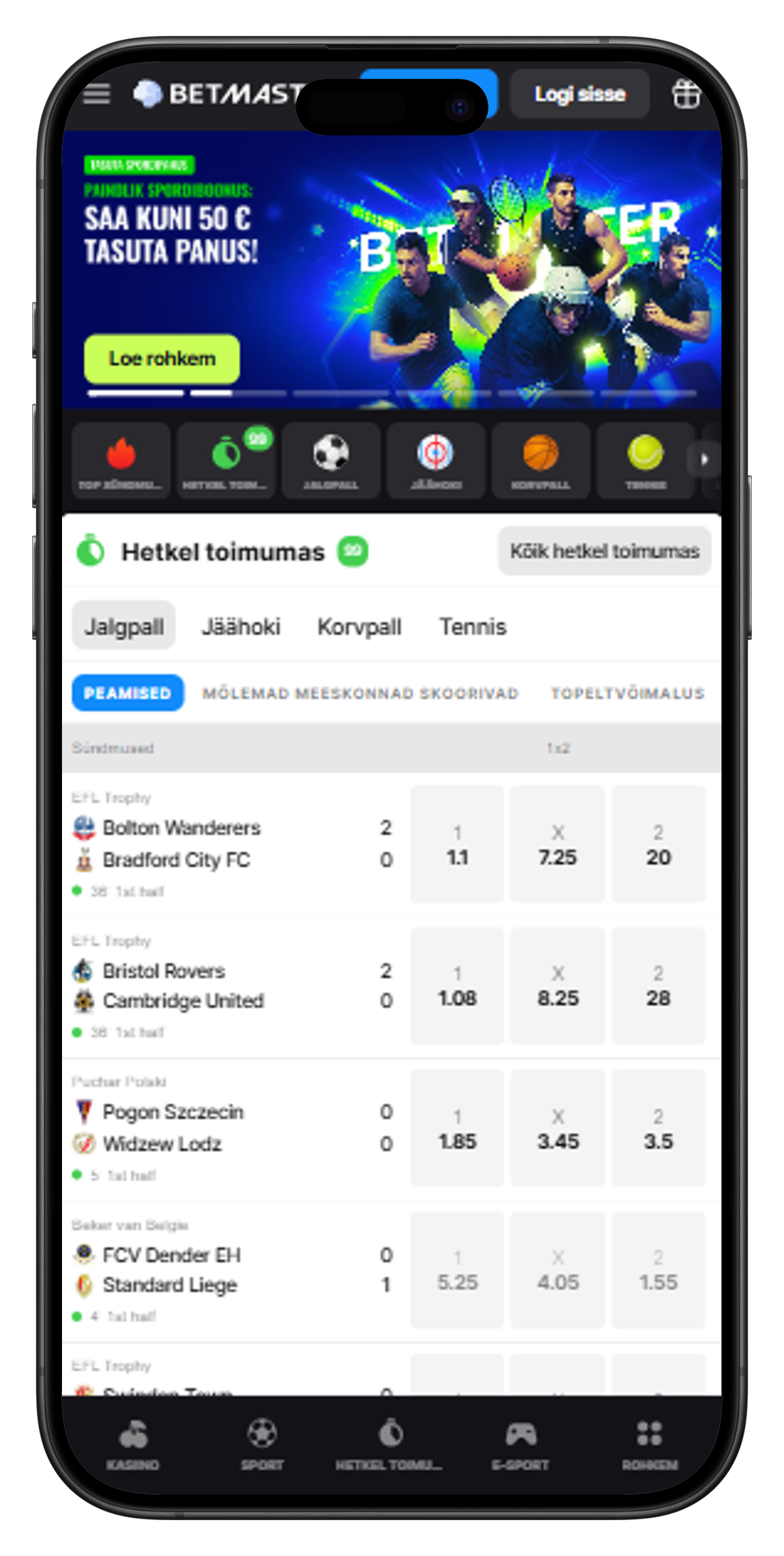 Spordisõber, valmista end ette! Betmaster Eesti pakub absoluutselt hullumeelset valikut spordialasid – alates Euroopa tippjalgpallist kuni iga nurga e-spordi lahinguteni. Koefitsiendid on neil tihti konkurentidest ees ja mis eriti lahe: nende live-panustamine viib emotsioonid lakke! Saidi kasutamine on megalihtne, nii et isegi kui oled algaja, leiad kiirelt oma tippi vääriva mängu. Ja nad viskavad pidevalt ka lisaboonuseid ja eripakkumisi, mis teevad panustamise veelgi tulusamaks. Minu jaoks on Betmaster Eesti spordiennustuste valdkonnas kindel liider.