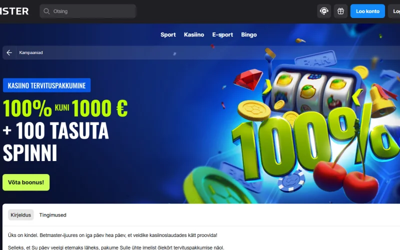 Uue mängijana saad valida endale parima alguse! Betmaster tervitusboonus pakub fantastilist võimalust kas kasiinos või spordis alustamiseks. See annab sulle kena lisasumma ja tihti ka tasuta keerutusi või riskivabu panuseid.